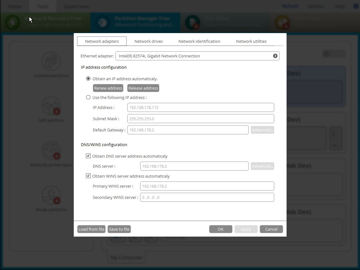 Nawiązuje połączenie sieciowe na bootowalnym nośniku odzyskiwania, aby zapisać kopię zapasową partycji / dysku twardego lub tylko kilku plików na komputerze sieciowym lub pobrać wcześniej utworzoną kopię zapasową z komputera sieciowego w celu odzyskania.
