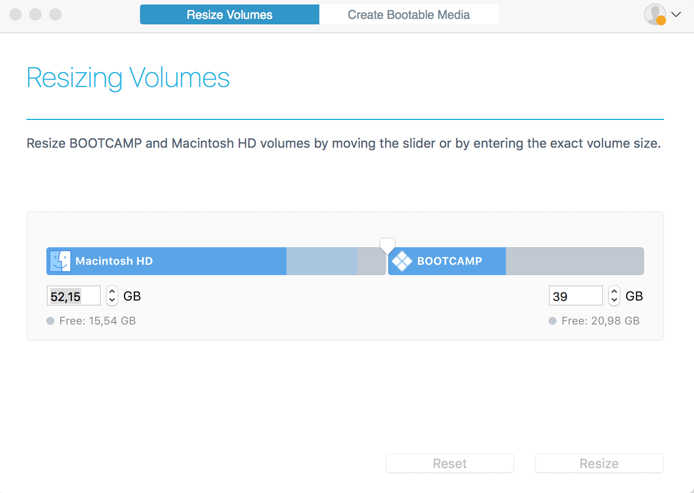 Przesuń suwak symbolizujący rozmiar partycji i kliknij ‘Resize’ lub wpisz dokładne rozmiary poszczególnych partycji w gigabajtach.
